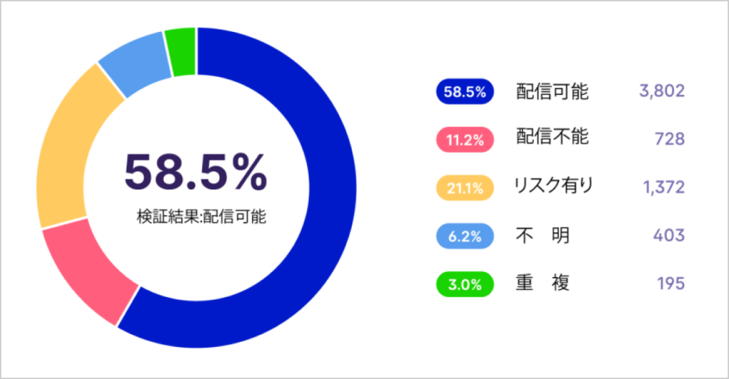 キャッチオールアドレスは正確な検証が難しい場合がありますが、独自アルゴリズムでリスクを特定し精度を高めています。また、キャッチオールアドレスの可能性があるアドレスについては、レポートにその旨の判定結果を出力が可能です。